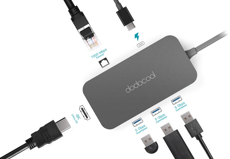 Хаб Dodocool DC50 6-in-1 содержит три полноценных разъема USB 3.0, разъем USB-C, поддерживающий технологию Power Delivery, а также выход HDMI и гигабитный разъем RJ-45.