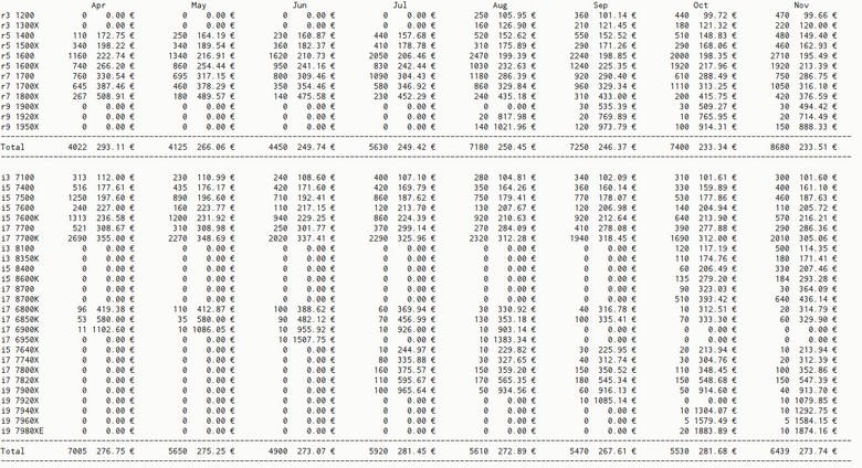 Ну и если говорить о самых популярных CPU, то среди решений AMD лидерство удерживает Ryzen 5 1600 (2710 процессоров за ноябрь), на втором месте расположился Ryzen 5 1600X (1920 процессоров), а на третьем — Ryzen 7 1700X (1050 процессоров). Всего за ноябрь было продано 8680 CPU AMD со средней стоимостью в 233,51 евро.