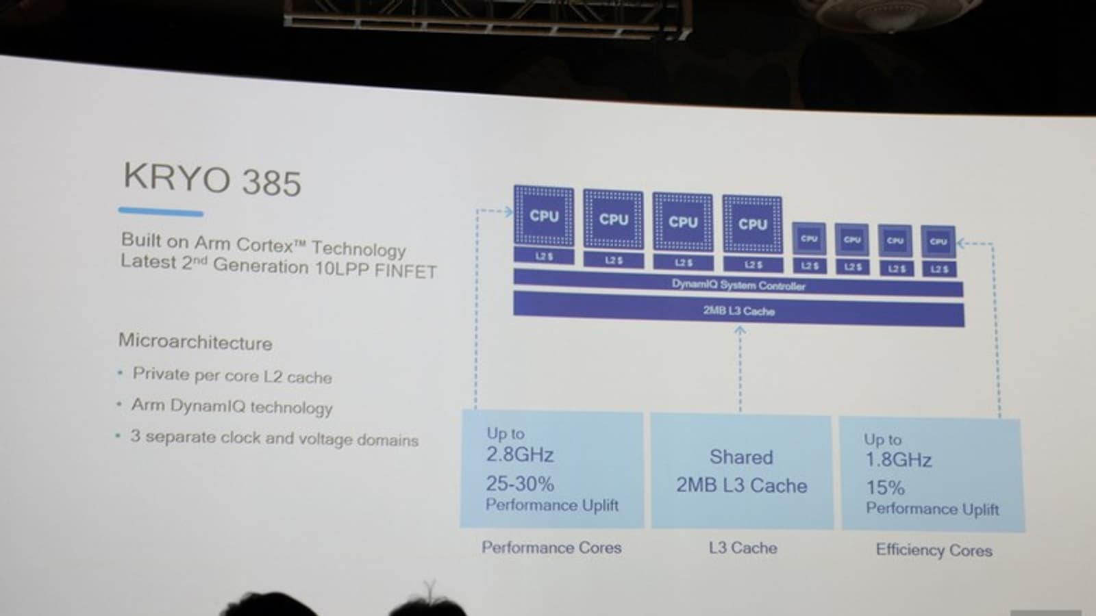 Вопреки слухам, Qualcomm не вернулась к референсным процессорным ядрам Cortex. Snapdragon 845 получил CPU Kryo 385, содержащий четыре высокопроизводительных ядра и четыре энергоэффективных. При этом сама архитектура процессорных ядер осталось той же, что и у Snapdragon 835. Старший кластер будет работать на частоте до 2,8 ГГц, а младший — до 1,8 ГГц. Это должно обеспечить преимущество в 30% перед CPU в Snapdragon 835. Что интересно, на слайдах можно видеть информацию о поддержке технологии ARM DynamIQ, но она позволяет собирать в кластеры разные процессорные ядра, а у Snapdragon 845 такой особенности, судя по всему, не будет.