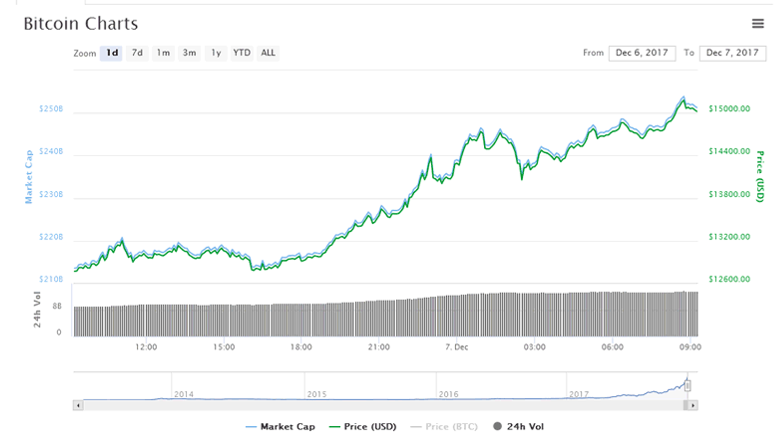 Как и ожидалось, курс Bitcoin перевалил за 15 000 долларов вскоре после того, как была взята отметка 14 000 долларов. Учитывая скорость, с которой стала увеличиваться стоимость криптовалюты, уже едва ли имеет смысл сообщать о росте курса на очередную тысячу, так что в следующей новости на эту тему будет курс более 20 000 долларов или... существенно более низкий, чем сейчас.