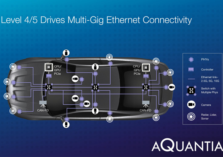 Повышение степени оснащенности автомобилей электронными узлами, связанное с развитием информационно-развлекательных систем и систем помощи водителю, а также с переходом к системам самоуправляемого вождения увеличивает потребность в высокоскоростных и надежных бортовых соединениях. Компания Aquantia специализирующаяся на решениях категории Multi-Gigabit Ethernet, представила микросхемы, ориентированные на использование в платформах для самоуправляемых транспортных средств.