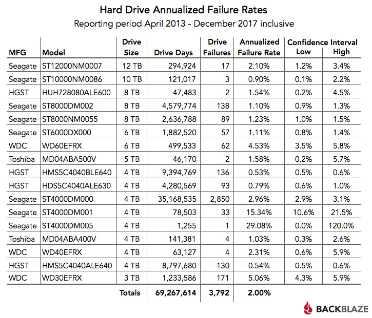 В конце 2017 года в компании эксплуатировалось 93 240 HDD, включая 1935 системных и 91 305 — для хранения данных, а всего с 2013 года через стойки Backblaze прошло 116 833 HDD. Такая внушительная статистика позволяет более-менее объективно оценить надежность конкретных моделей. Уточним, что для подсчетов использовались только данных по моделям, эксплуатируемым в количестве не менее 45 штук.