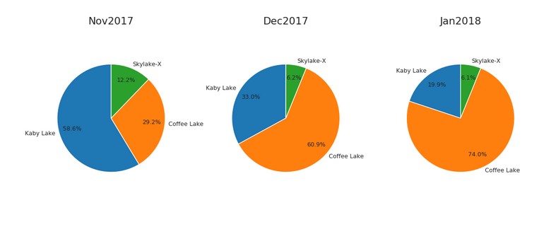 Как можно видеть на диаграмме, с декабря продажи Intel существенно выросли. Причём выросли благодаря лишь одной модели — Core i7-8700K. Откуда вдруг возник столь резкий интерес к этой модели, неясно, а вот касательно снижения продаж CPU AMD ситуация может быть обусловлена тем, что потребители ждут скорого появления новых моделей.