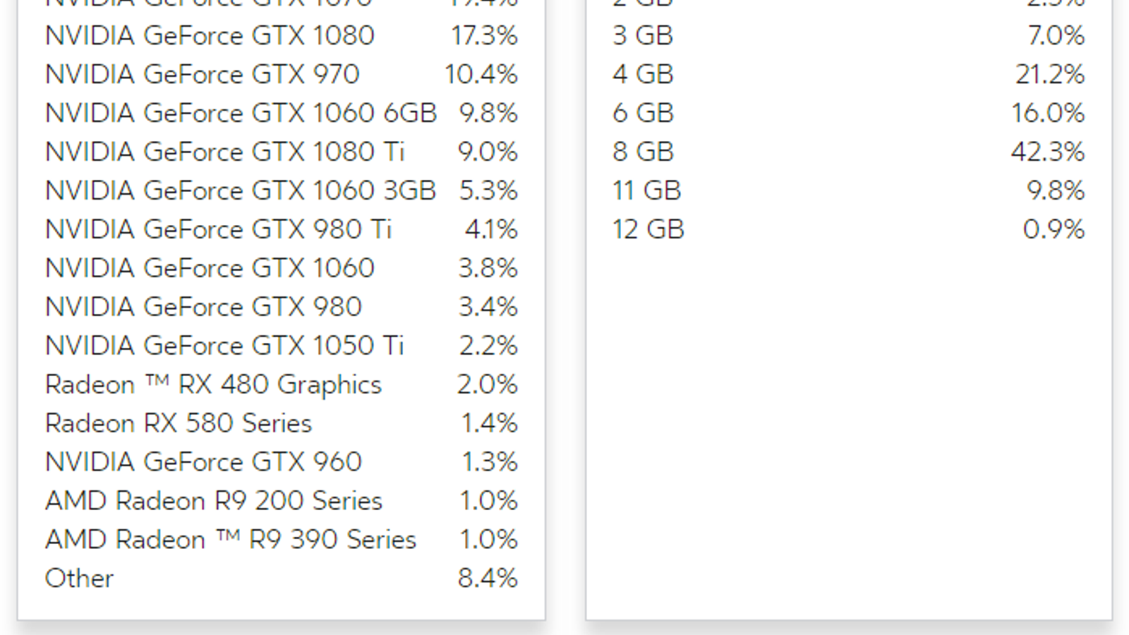 Самой популярной видеокартой является GeForce GTX 1070 (19,4%), а среди адаптеров AMD самый распространённый — Radeon RX 480 (2%). Если говорить об операционных системах, то 94,2% занимает Windows 10.