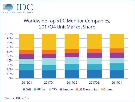 Лидером рынка в прошлом квартале была Dell, реализовавшая 6,1 млн устройств, заняв 19,3% рынка и нарастив продажи на 8,8%. HP увеличила поставки на 7,3%, продав 4,6 млн мониторов и заняв 14,6% рынка.