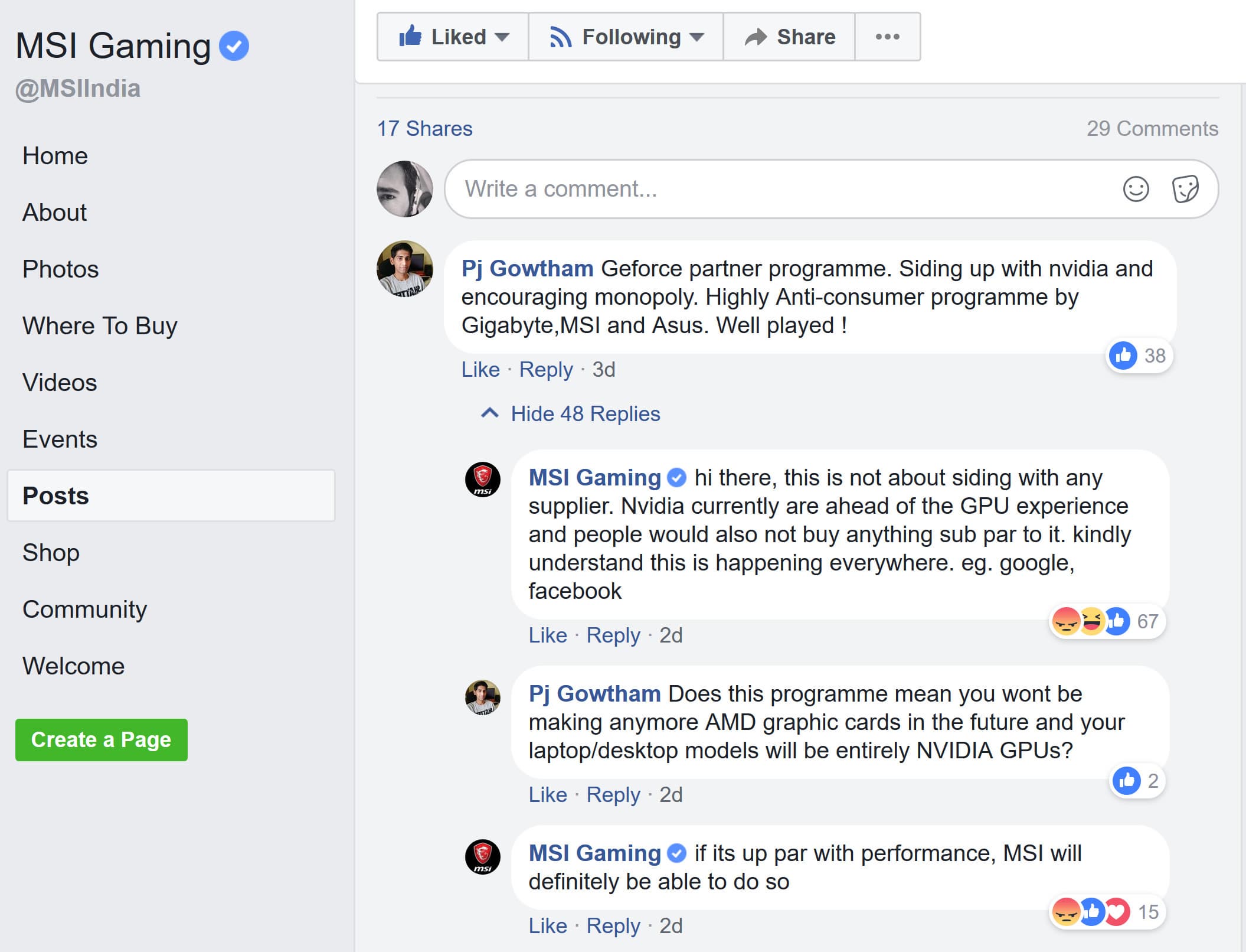 Если это не является убедительной причиной, то можно зайти на сайт MSI и увидеть, что из ассортимента графических карт с GPU AMD исчезли все модели линейки Gaming. А на официальной странице компании в Facebook от имени учётной записи MSI и вовсе косвенно был подтверждён факт присоединения компании к программе Nvidia, хотя потом MSI удалила комментарий и опровергла его.