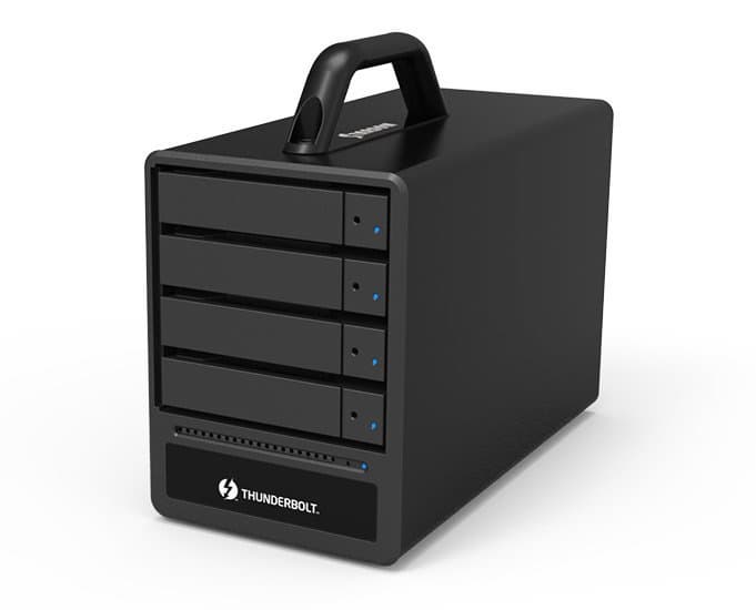 Под маркой Stardom, принадлежащей компании Raidon Technology, представлен дисковый массив SR4-TB3. Он рассчитан на четыре накопителя типоразмера 2,5 или 3,5 дюйма с интерфейсом SATA 6 Гбит/с. Аппаратный контроллер RAID, используемый в SR4-TB3, поддерживает конфигурации RAID 0, 1, 5, 10 и JBOD. Массив оснащен двумя портами Thunderbolt 3. Подключение к хосту по интерфейсу Thunderbolt 3 позволяет получить в четыре раза большую пропускную способность по сравнению с подключением по интерфейсу USB 3.1 Gen 2. Наличие второго порта Thunderbolt 3 дает возможность формировать цепочки, включающие до шести совместимых устройств.
