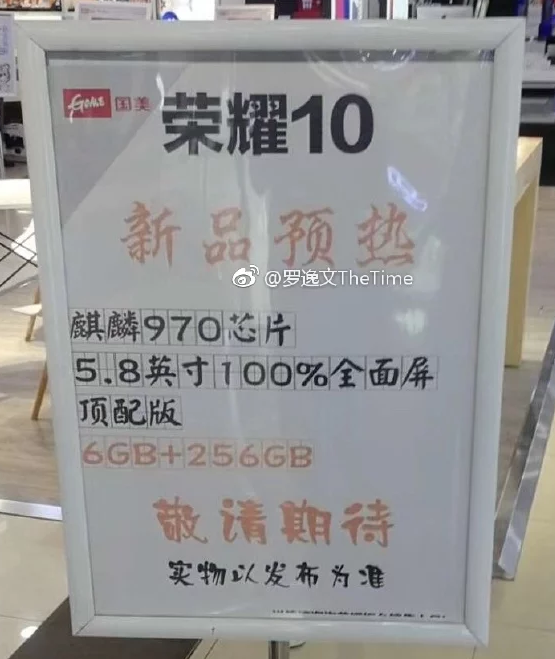 Что касается параметров, снимок какого-то рекламного стенда указывает на SoC Kirin 970, 6 ГБ оперативной памяти и 256 ГБ флэш-памяти. Дисплей будет иметь диагональ 5,8 дюйма.