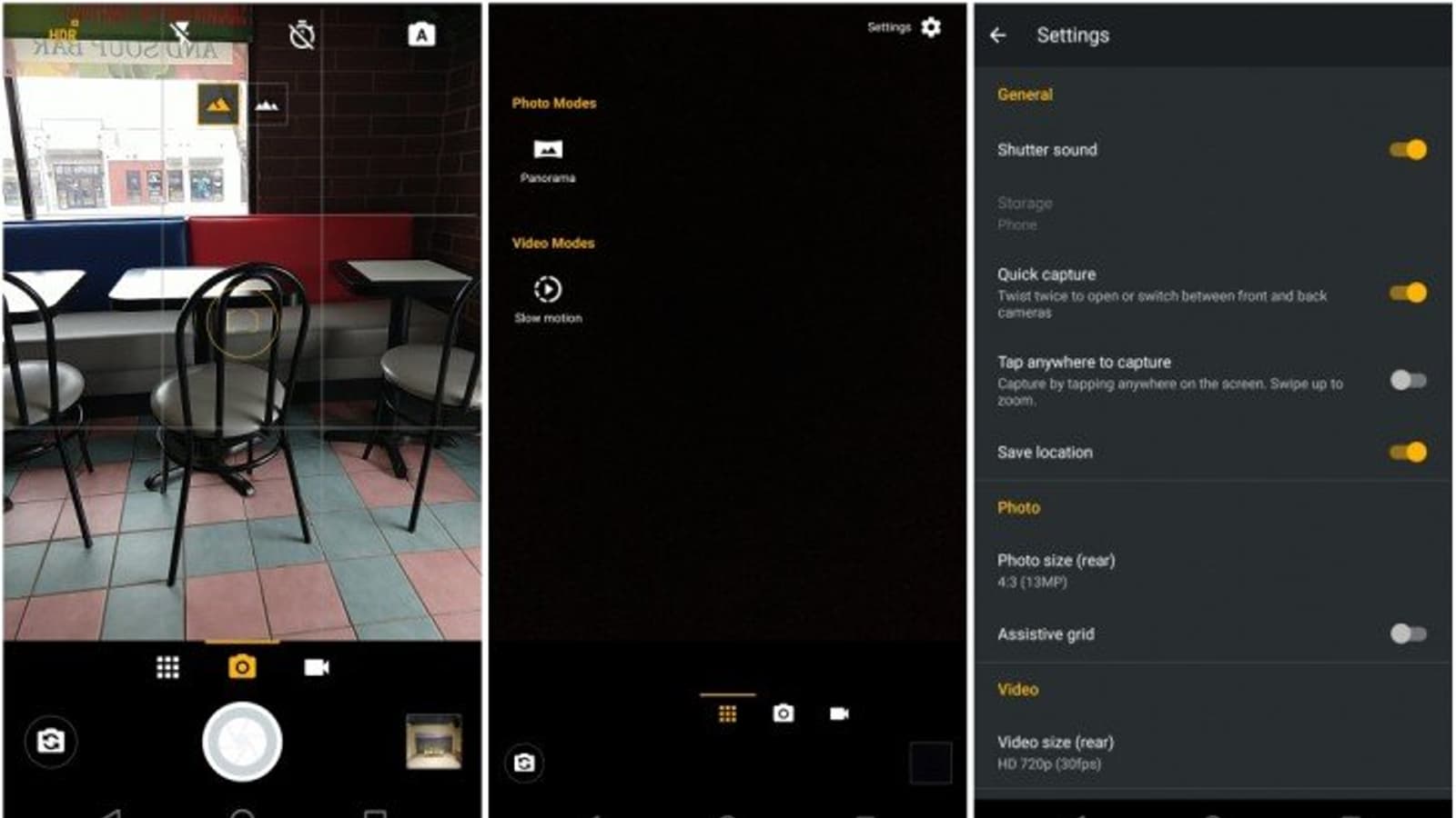 Интерфейс приложения разделен на три секции: фотография, видео и режим. Выбор осуществляется прокруткой. В секции режима находятся настройки. Экран настроек стал непрозрачным и больше не выводится поверх видоискателя.