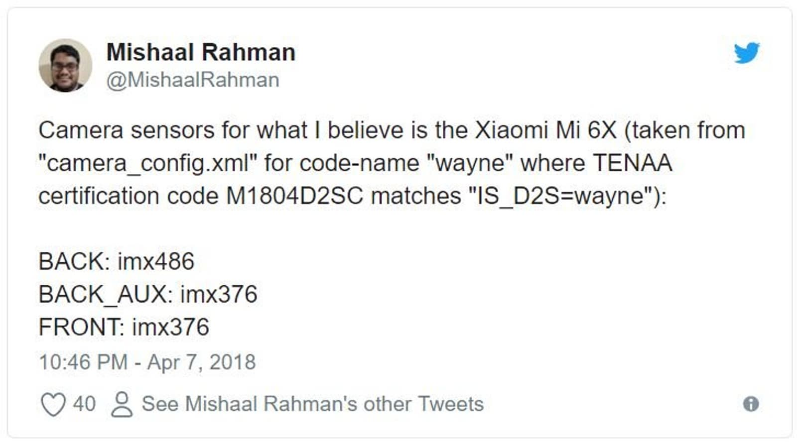Господин Рахман проанализировал файл camera_config.xml, относящийся к смартфону под кодовым обозначением «Wayne» (оно как раз и приписывается Mi 6X) и обнаружил в нем упоминание трех датчиков Sony: двух IMX376 (20 Мп) и одного IMX486 (12 Мп). Соответственно, один IMX376 будет использован во фронтальной камере, а другой станет частью дополнительного модуля тыльной камеры. В основном модуле тыльной камеры будет использован IMX486.