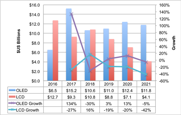 В 2017 году рост составил 34%, но уже на 2018 год аналитики прогнозировали уменьшение роста до 5%, а на 2019 год — сокращение на 21%. Согласно новому прогнозу, спад будет стремительнее: уже в текущем году расходы на оборудование для производства дисплеев сократятся по сравнению с предыдущим годом на 13%.