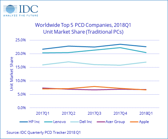 Лидером рынка остаётся HP с долей 22,6%. Компания смогла продать 13,68 млн ПК, нарастив показатель на 4,3%, что немало, учитывая ситуацию по рынку в целом. А вот Lenovo, разместившаяся на втором месте, как раз полностью соответствует общей ситуации. Компания продала 12,31 млн ПК, что соответствует результату годичной давности. Благодаря этому она смогла занять 20,4% рынка.