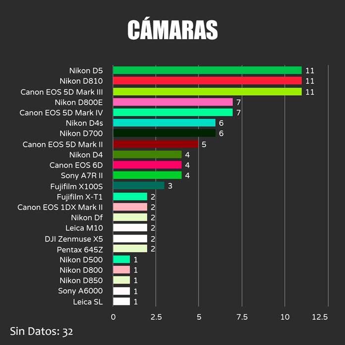 Если сделать разбивку по моделям, камерами Nikon D5, Nikon D810 и Canon EOS 5D Mark III было снято по одиннадцать призовых фотографий, камерами Nikon D800E и Canon EOS 5D Mark IV — по семь. Модели Nikon D4S и Nikon D700 заняли третье место, поскольку каждой из них было сделано по шесть снимков, победивших в конкурсе.