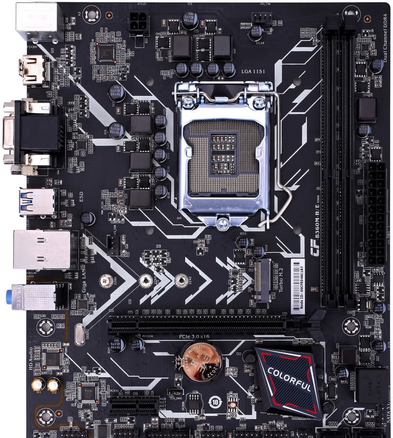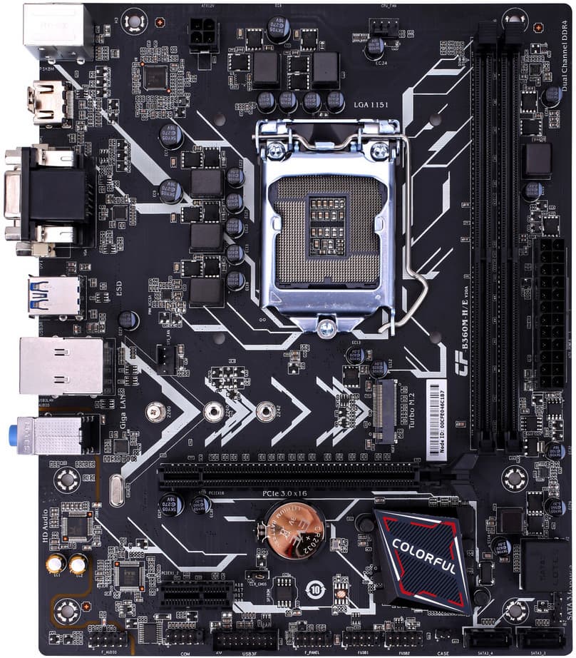 Плата C.B360M-HD Pro V20 типоразмера mATX оснащена двумя слотами для модулей памяти DIMM DDR4, одним слотом расширения PCIe 3.0 x16 и одним слотом расширения PCIe 3.0 x1. Кроме того, есть слот M.2, в который выведены интерфейсы PCIe x4 и SATA. Помимо него, накопители можно подключать к четырем портами SATA 6 Гбит/с. В оснащении платы можно выделить шесть портов USB 3.0, порт Gigabit Ethernet, шестиканальную звуковую подсистему и видеовыходы VGA, DVI и HDMI.