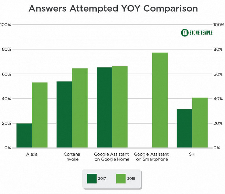 Тут указано, как изменился процент полностью правильных ответов за прошедший год. И, как можно видеть, вырос он лишь у Cortana, тогда как у остальных ИИ по каким-то причинам снизился.