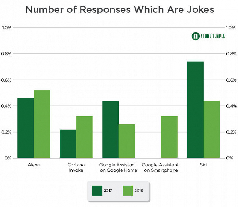 Ну и напоследок посмотрим, насколько хорошо у голосовых ассистентов с чувством юмора. Диаграмма ниже показывает процент ответов с шутками.
