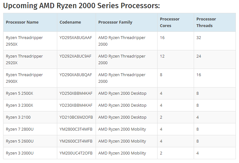 Итак, в ближайшее время нас ждёт анонс процессоров Ryzen 3 2100, Ryzen 3 2300X и Ryzen 5 2500X для настольного сегмента, Ryzen 3 2000U, Ryzen 5 2600U и Ryzen 7 2800U — для мобильного. Также известно о трёх Ryzen Threadripper второго поколения: Threadripper 2900X, Threadripper 2920X и Threadripper 2950X.