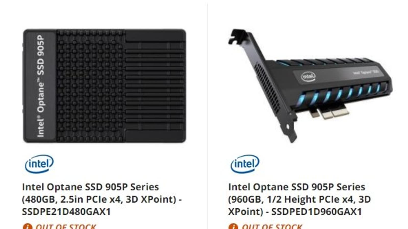 Изображение выше – скриншот страничек интернет-магазина Newegg. На картинке фигурируют два представителя Optane SSD 905P в двух разных типоразмерах: 2,5 дюйма (U.2) и PCIe. Причем последний снабжен голубой подсветкой. Все больше и больше производителей оснащают свои накопители подсветкой и, как видим, Intel тоже не стала исключением.
