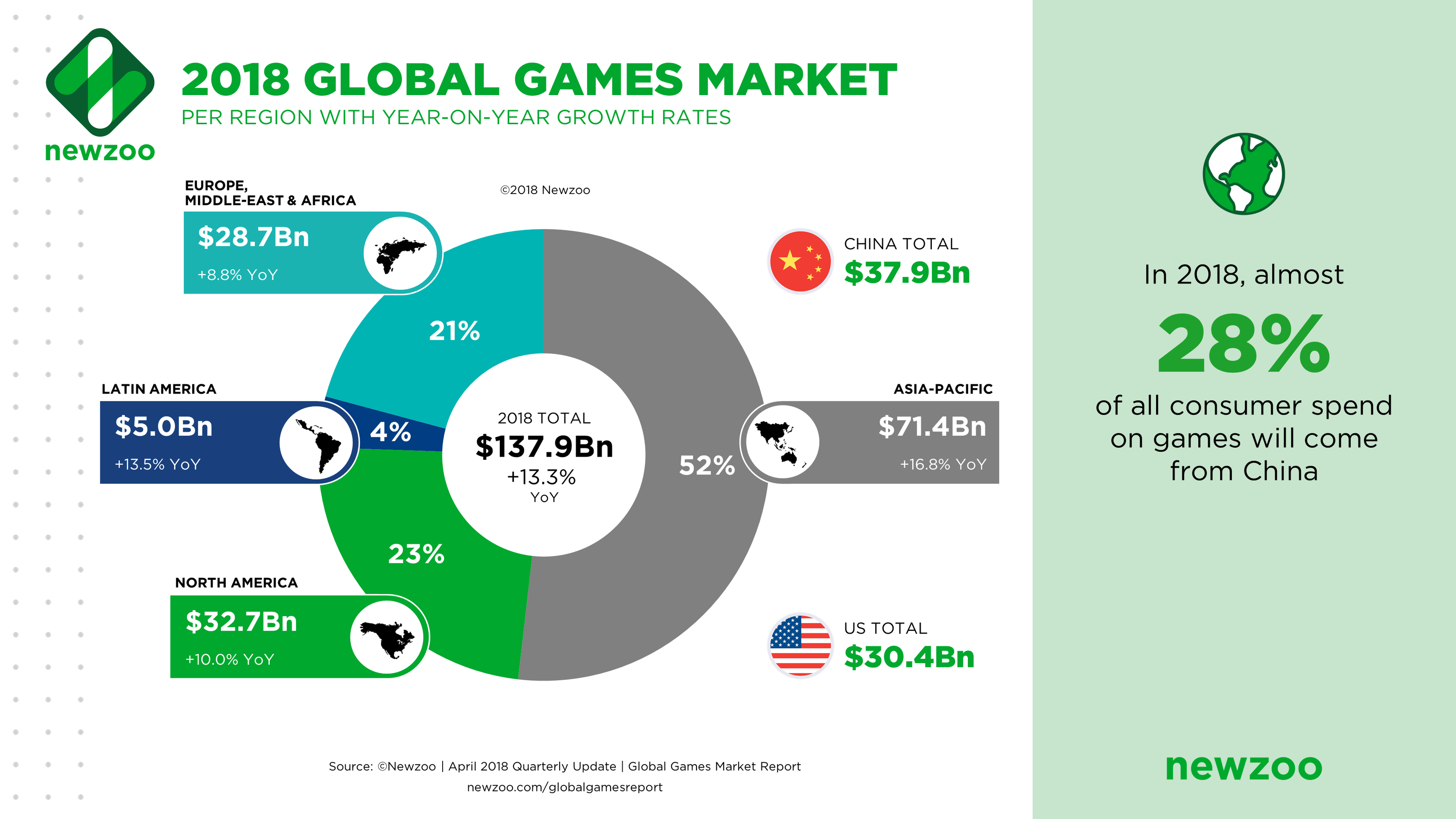 Аналитики Newzoo утверждают, что рынок игр (компьютерных, мобильных и прочих) по итогам текущего года достигнет отметки в 137,8 млрд долларов, что на 13,3% превысит показатель 2017 года.