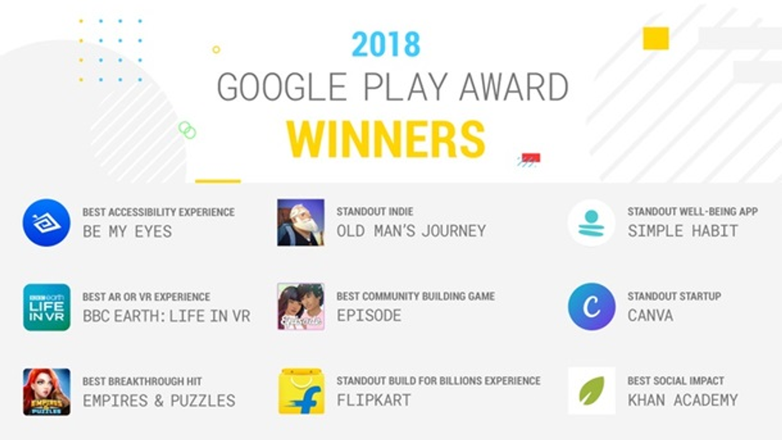 В этот раз победители выбирались в девяти различных категориях, при этом приложения оценивались по таким критериям, как дизайн, качество, влияние на производительность мобильного устройства и так далее. Все приложения, которые стали победителями, были выпущены с апреля 2017 года или получили крупное обновление за последний год.