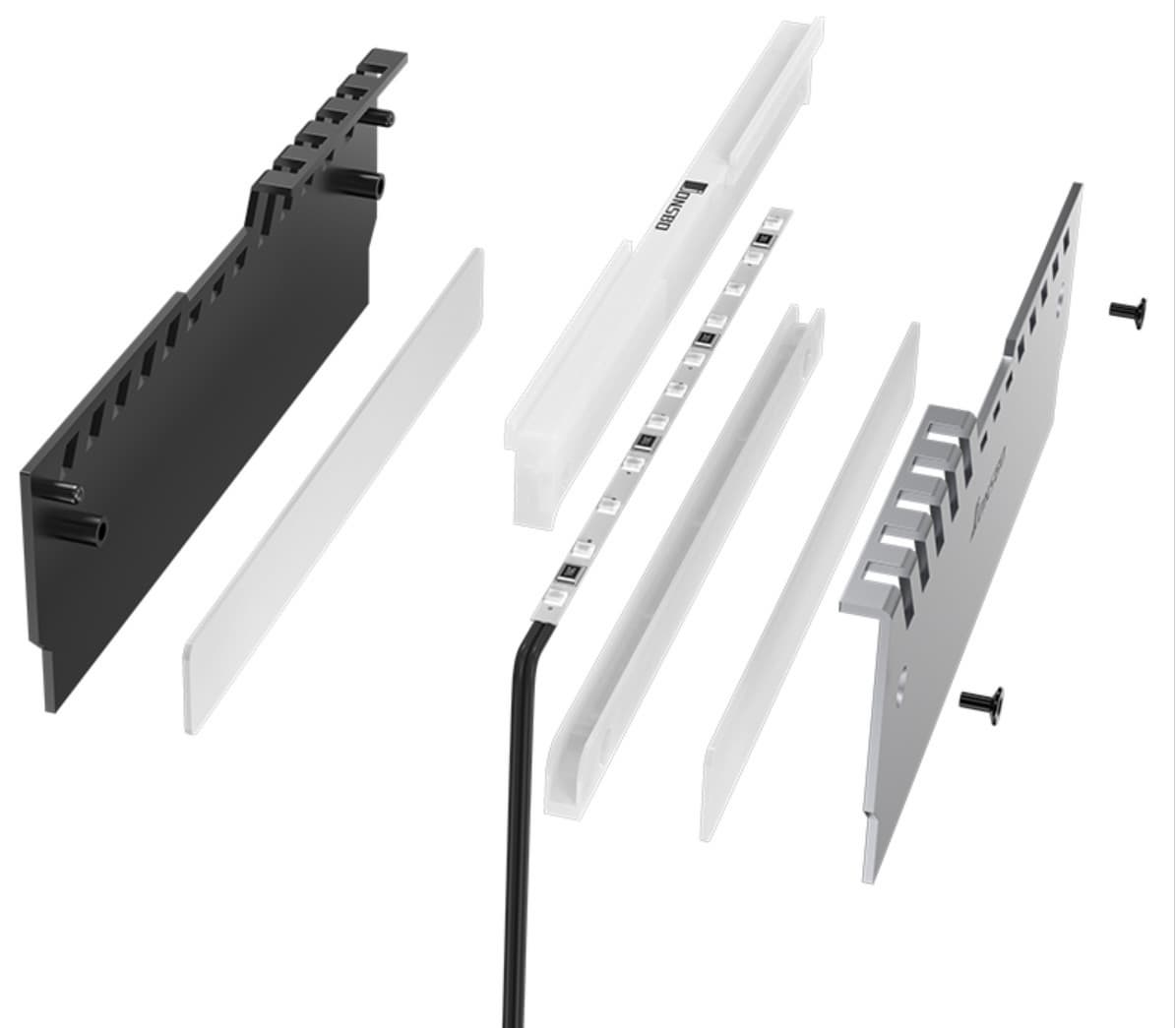 Комплект рассчитан на два модуля памяти. Он включает алюминиевые пластины, скрепляемые винтами. Между ними располагается светодиодная лента и составной рассеиватель. При габаритах 141 x 8,5 х 43 мм один радиатор в сборе весит примерно 114 г.
