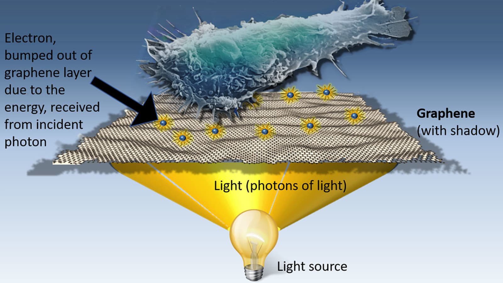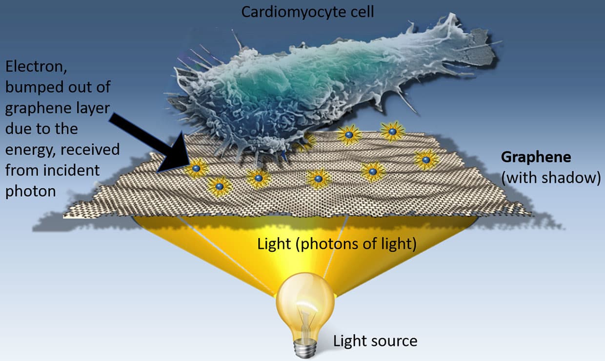 Ученые из Калифорнийского университета знали, что графен способен преобразовывать свет в электричество (при этом он в тысячу раз превосходит по светочувствительности материалы, используемые в современных камерах) и решили проверить, способно ли это электричество стимулировать клетки человека. В ходе экспериментов выяснилось, что может.