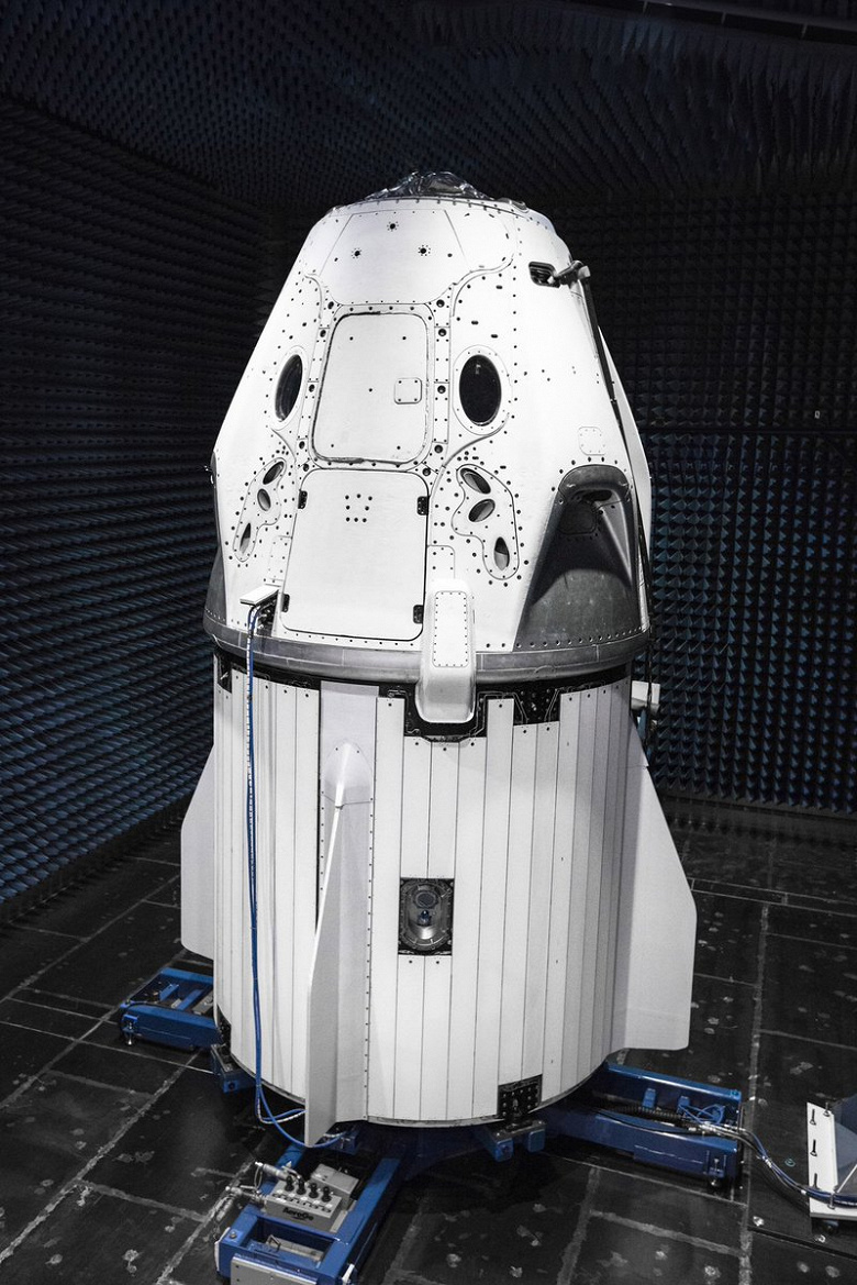 Илон Маск (Elon Musk) опубликовал снимок пилотируемого корабля Crew Dragon. Корабль запечатлен в экранированной камере, где проходит тестирование на устойчивость к электромагнитным помехам.