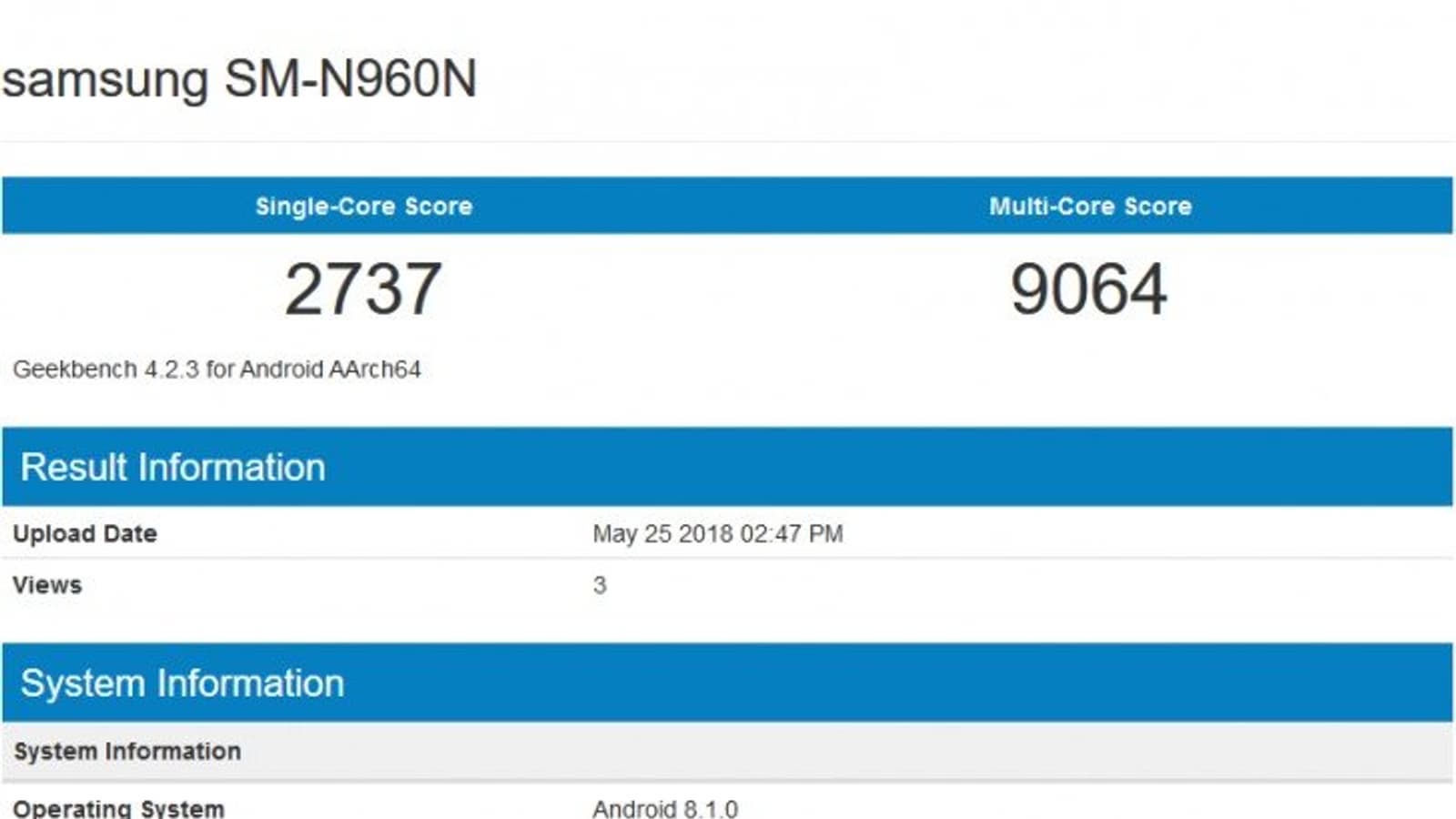 В тесте одноядерной производительности устройство набрало 2737 баллов, в тесте многоядерной производительности — 9064 балла. Конфигурация протестированного смартфона включает 6 ГБ оперативной памяти, а работает он под управлением Android 8.1.
