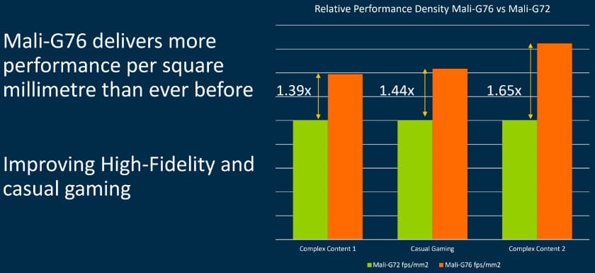 ARM обещает прирост относительно Mali-G72 на 30-65%, но имеется в виду не производительность, а производительность относительно площади GPU. Энергоэффективность была улучшена на 30%, а в задачах машинного обучения производительность выросла в 2,7 раза. Новый GPU поддерживает OpenGL ES 1.1, 2.0, 3.1, 3.2, Vulkan 1.1 и OpenCL 1.1, 1.2, 2.0 Full Profile.