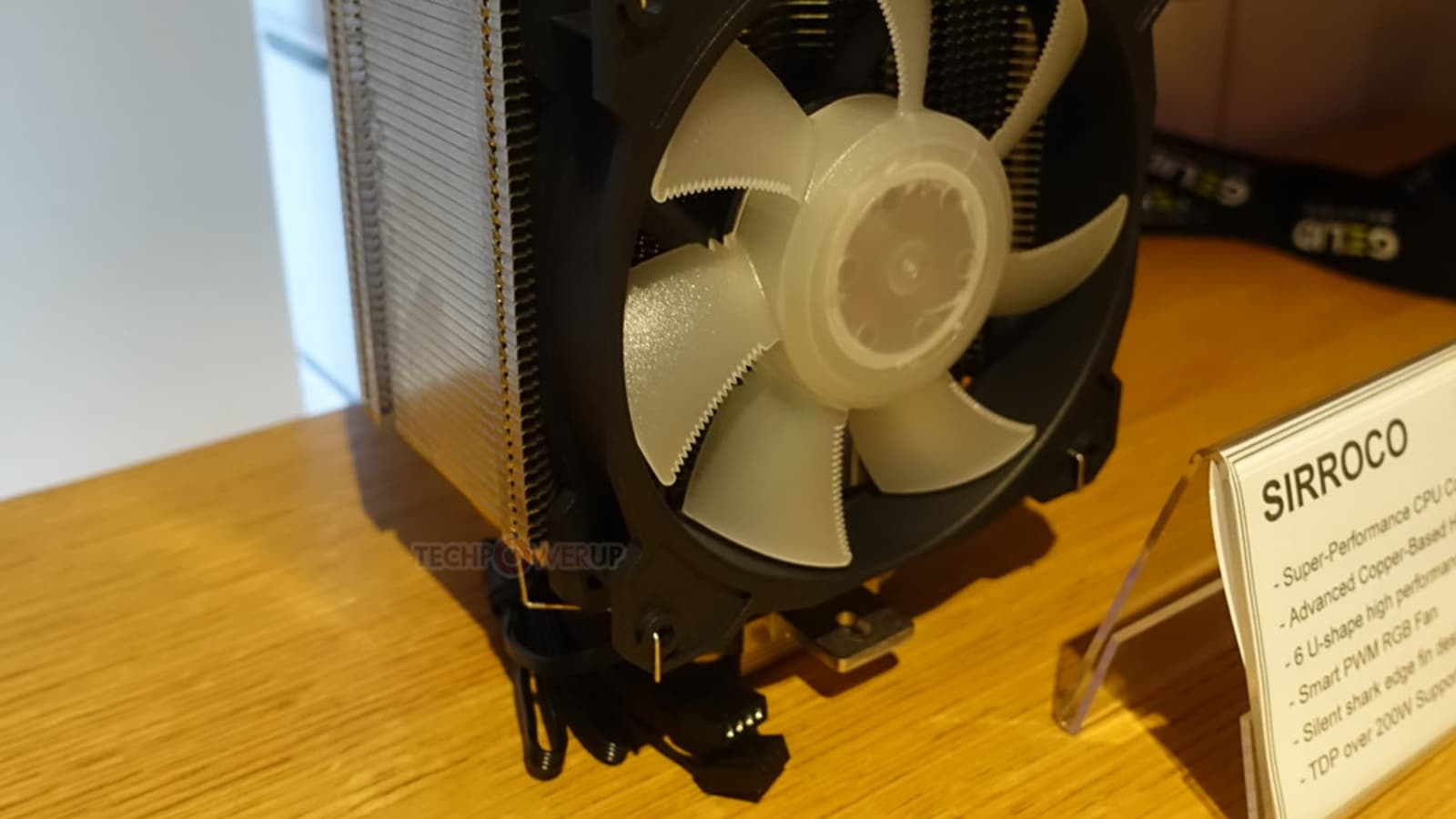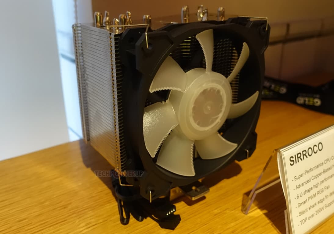 В экспозицию GELID на выставке Computex 2018 вошла процессорная система охлаждения Sirroco. Она построена на классической схеме с радиатором, алюминиевые пластины которого нанизаны на концы U-образных тепловых трубок. Центральными частями медные никелированные тепловые трубки, которых в Sirroco шесть штук, пропущены через медное основание. На радиаторе установлен фирменный вентилятор Radiant D типоразмера 120 мм.