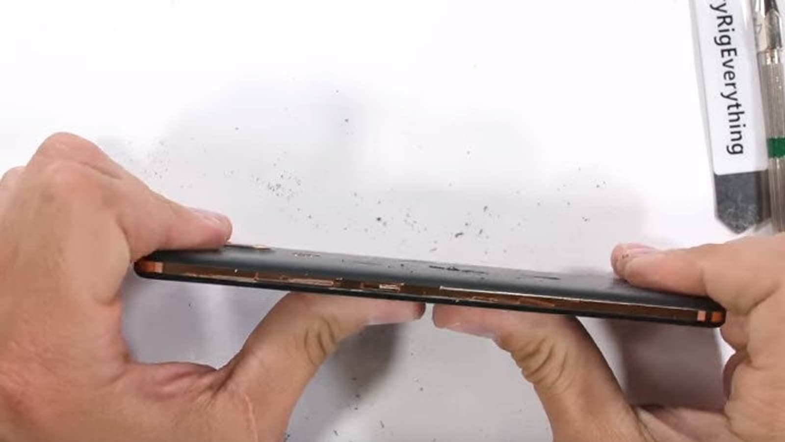 Наибольший интерес в тестах JerryRigEverything всегда вызывает проверка прочности конструкции корпуса смартфона на изгиб. Автор видеоролика громко заявил, что это один из самых крепких смартфонов, которые попадали к нему в руки. Ему не удалось согнуть корпус или хотя бы вызывать появление трещин на дисплее.