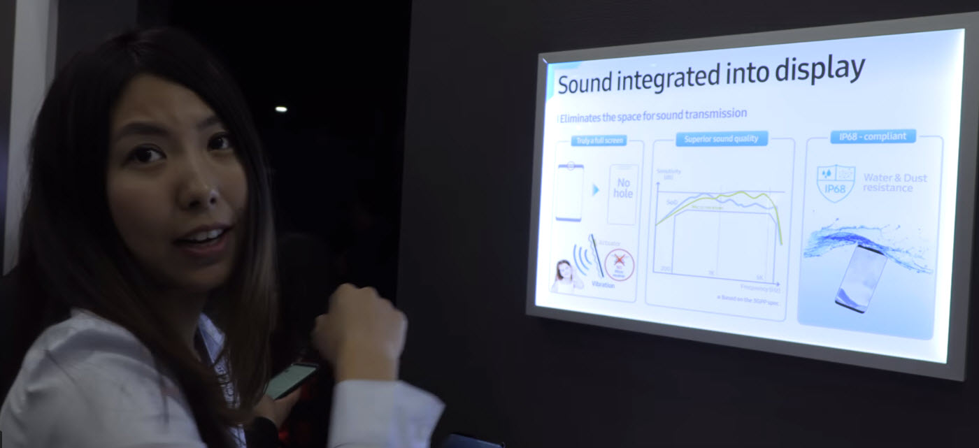 Представитель компании рассказала о концепции Sound integrated into display на примере устройства, которое был размешено в корпусе смартфона Samsung Galaxy S9+.