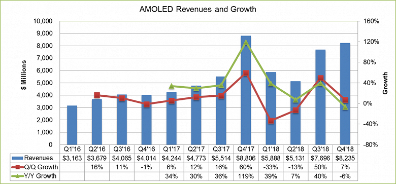 В первом квартале этого года наблюдалось падение продаж на 33% относительно рекордного четвертого квартала 2017 года. При этом в годовом выражении рынок вырос на 39%. Во втором квартале сокращение продолжилось под влиянием сезонных факторов. Аналитики DSCC ожидают, что рынок панелей OLED восстановится во втором полугодии, так что оборот отрасли за год достигнет 26,95 млрд долларов.