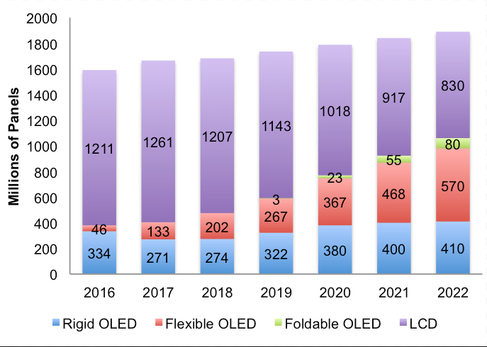 Основной сегмент панелей OLED для смартфонов — гибкие панели. В будущем году появится новый сегмент — складные панели, однако в ближайшие годы доля таких панелей будет сравнительно невелика.