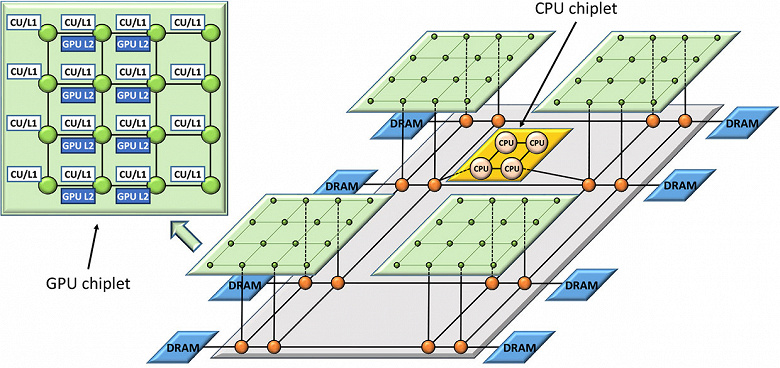 Микроэлектроника подходит к этапу, когда узлы компьютера, реализуемые отдельными микросхемами на печатных платах, могут оказаться кристаллами на общей промежуточной подложке (интерпозере). Эта концепция «чиплетов» позволит увеличить скорость обмена данными внутри системы и уменьшить размеры компьютеров.