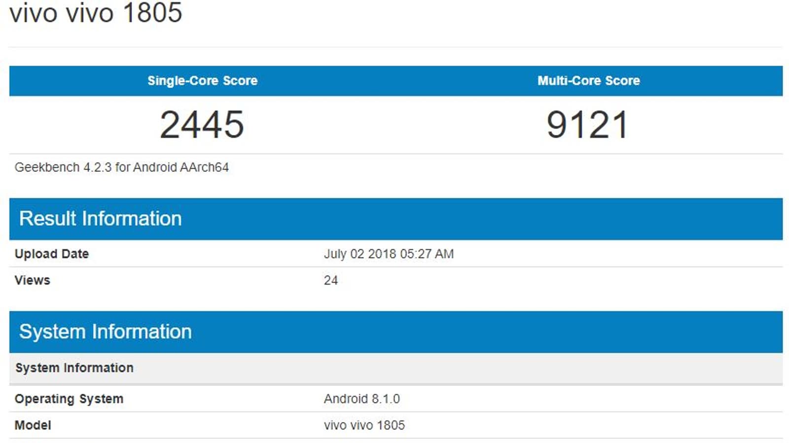 Vivo 1805 наряду с SoC Snapdragon 845 использует операционную систему Android 8.1.0 и имеет 8 ГБ оперативной памяти – это то, что о нем можно сказать точно. Можно также предположить, что устройство предложит большой экран (диагональю больше 6 дюймов) и как минимум одну сдвоенную камеру – чтоб не отставать от других флагманов. Но учитывая, что аппарат засветился в Geekbench только вчера, на скорый выпуск его рассчитывать не стоит.