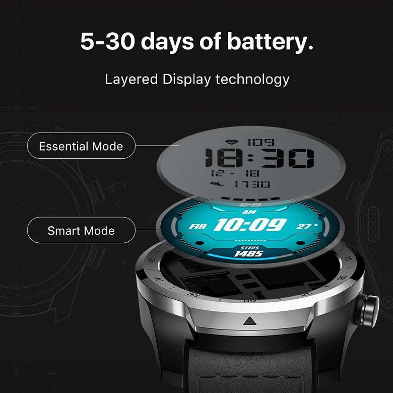 Что касается технических данных, основной особенностью устройства, работающего под управлением Wear OS, как известно, является наличие двух экранов, расположенных в два слоя. Один из них — цветной, типа AMOLED. Он прикрыт монохромной жидкокристаллической панелью, прозрачной в неактивном состоянии. Цветной экран обеспечивает полный доступ к функциям умных часов, но он потребляет сравнительно много энергии, а монохромный выводит только ключевую информацию, однако позволяет часам дольше работать без подзарядки. Время автономной работы составляет пять дней в гибридном режиме с автоматическим переключением между экранами или месяц при использовании только монохромного экрана.