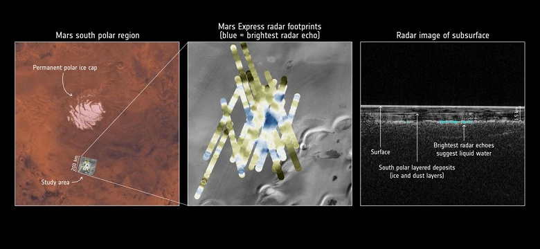 Однако свежие данные указывают на то, что на Красной планете и сейчас может быть весьма много воды. Просто она спрятана под поверхностью. При помощи радара MARSIS, установленного на борту космического аппарата Mars Express, учёные обнаружили район в области Planum Australe, где сигналы радара сильно отличались от таковых на других областях. Учёные утверждают, что сигналы свидетельствуют о наличии под поверхностью планеты водоёма шириной около 20 км. Он находится на глубине примерно 1,5 км. Глубина водоёма, к сожалению, измерению не подлежит из-за недостаточной мощности аппаратуры, но она точно составляет «не менее метра». То есть это может быть как водоносный горизонт, так и целое озеро глубиной в десятки или более метров.