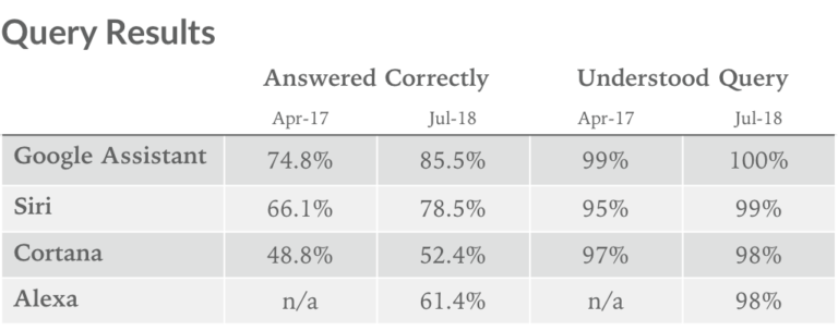 Как можно видеть по таблице, лидирует всё ещё Google Assistant. Этот ИИ сумел понять все 800 вопросов и ответил правильно на 85,5% из них. Отметим, что под вопросами подразумеваются также и команды. К примеру, запуск музыки или навигации.