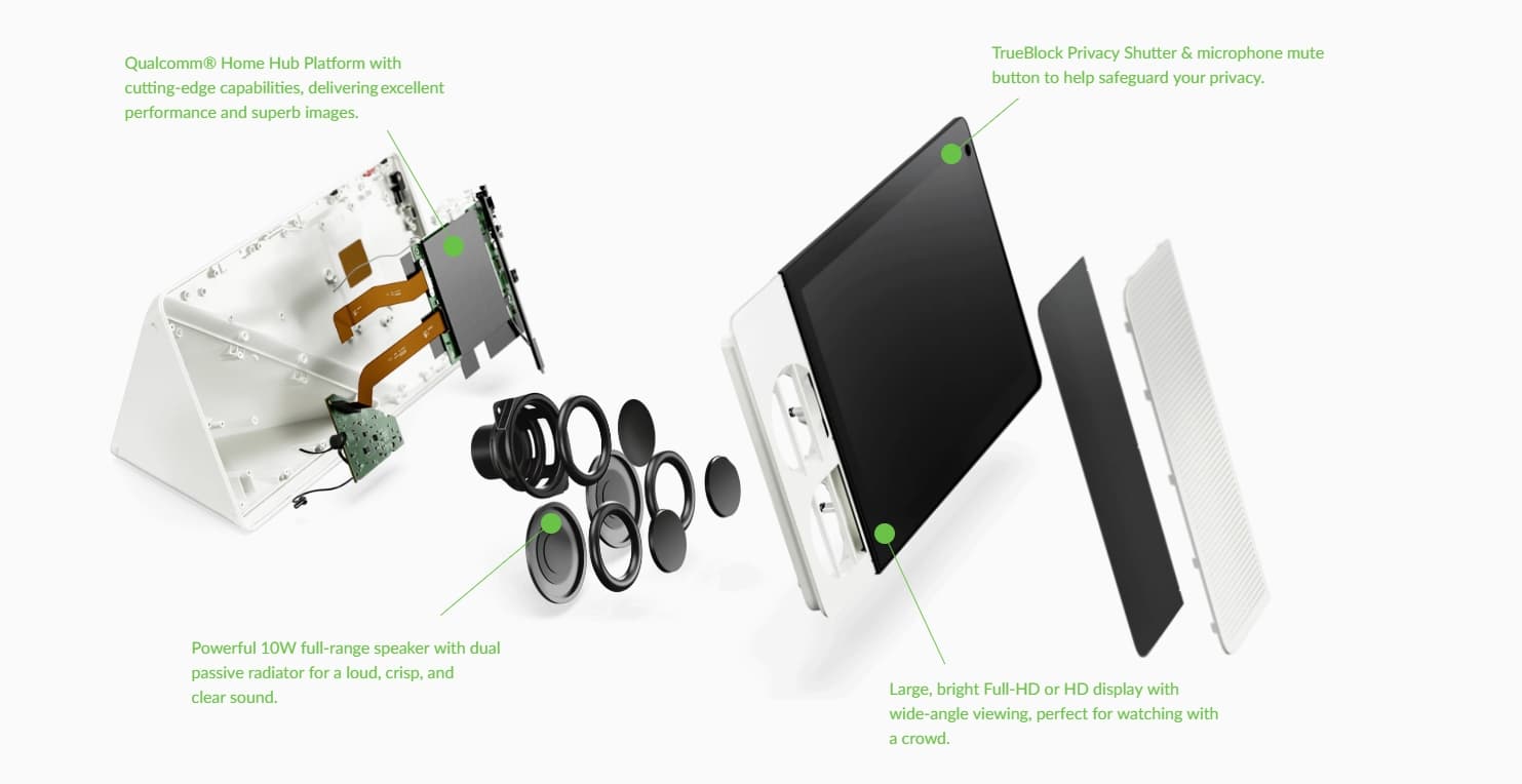 Итак, моделей две: Smart Display 8” и Smart Display 10”. Как можно догадаться, отличаются они экранами. У первой диагональ составляет 8 дюймов, у второй — 10,1 дюйма. Используются панели IPS разрешением 1280 х 800 и 1920 х 1200 пикселей соответственно. В основе новинок лежит Qualcomm 624 Home Hub Platform. Это 14-нанометровая платформа с восемью ядрами Cortex-A53 (1,8 ГГц) и GPU Adreno 506. Объём оперативной и флэш-памяти указан как до 2 ГБ и до 4 ГБ соответственно, то есть в теории может быть и меньшим.