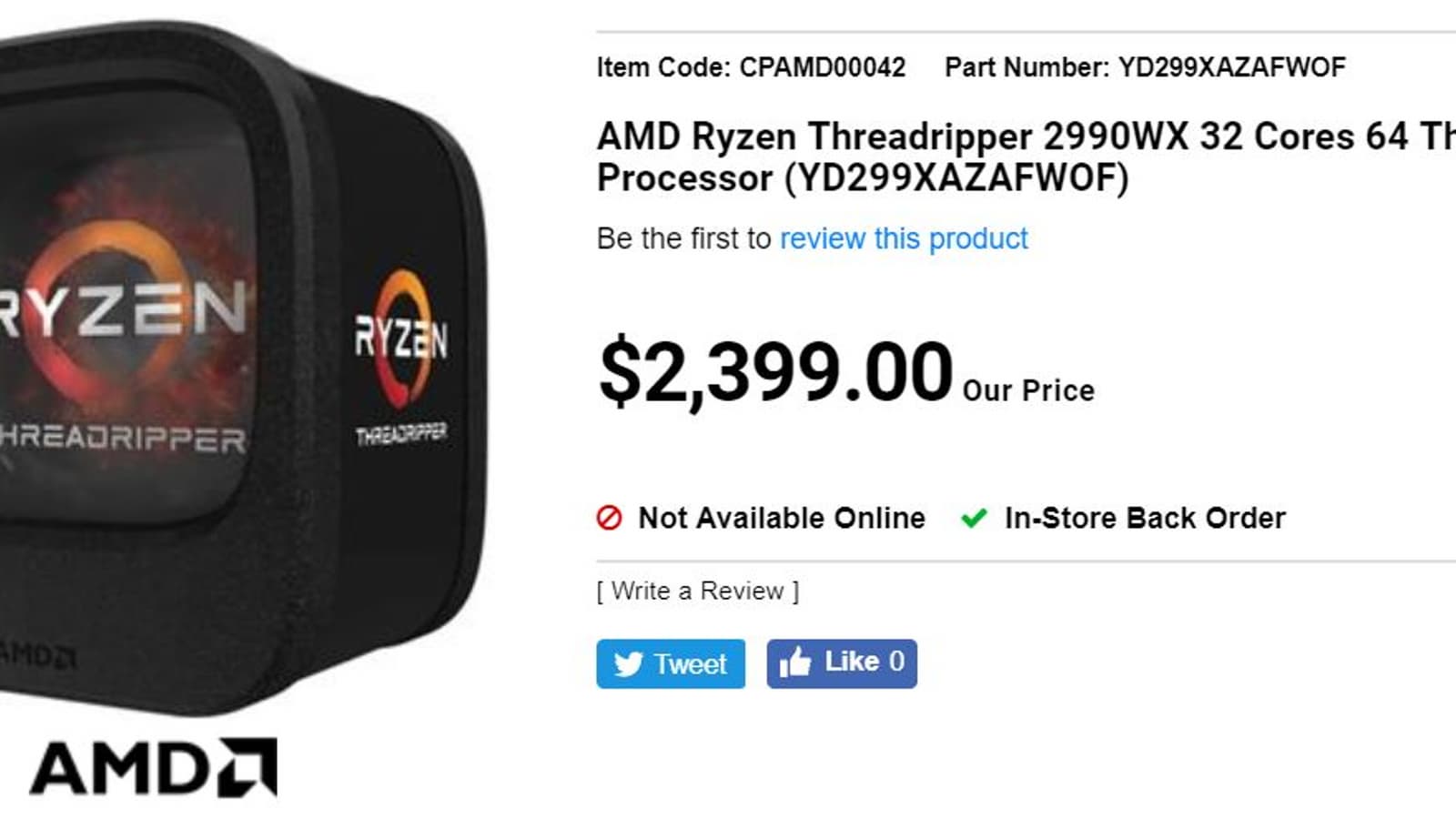 Онлайновый магазин CanadaComptuers «засветил» цену 32-ядерного процессора AMD Threadripper 2990X. Она примерно равна 1850 долларам. Эта цена близка к фигурировавшему в предыдущей утечке Cybersport значению 1509 евро.