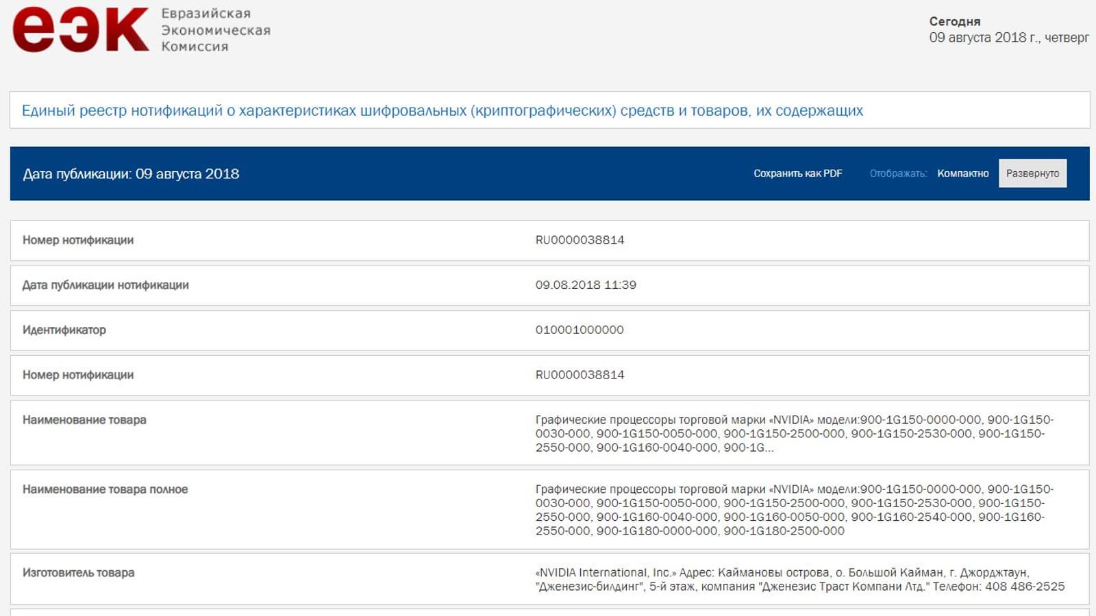 Записи о 3D-картах Nvidia GeForce и Quadro следующего поколения сегодня появились в «Едином реестре нотификаций о характеристиках шифровальных (криптографических) средств и товаров, их содержащих» Евразийской экономической комиссии (ЕЭК).