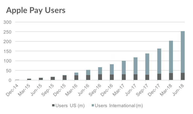 Специалисты считают, что активная пользовательская база Apple Pay составляет более 250 млн человек. За последние 12 месяцев объем транзакций, совершенных через Apple Pay, увеличился на 200%.