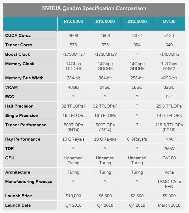 Интересно тут то, что при меньшем количестве исполнительных блоков у старших из новинок, они при этом якобы быстрее Quadro GV100, основанной на GPU GV100. Но пока эти данные не подтверждены.