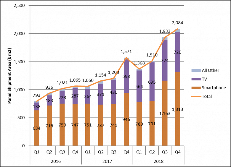 Аналитики DSCC полагают, что рост возобновится уже в текущем квартале. Суммарная площадь панелей для смартфонов, отгруженных за текущее полугодие, будет на 47% больше, чем во втором полугодии 2017 года.