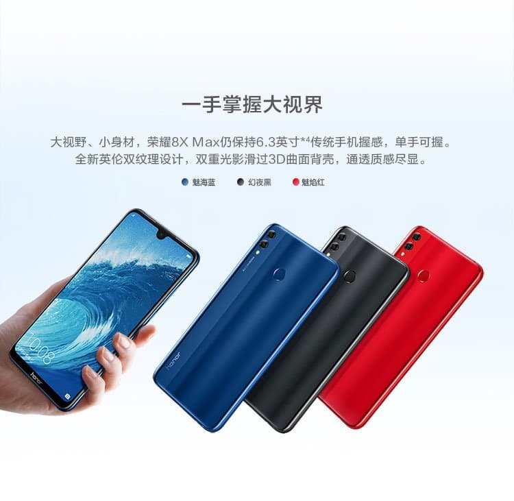 Honor 8X Max идёт с быстрой зарядкой мощностью 18 Вт, которая обеспечивает 40% заряд за 10 минут. Он имеет размеры 177,6 x 86,3 x 8,1 мм при весе в 210 граммов. На нижней грани присутствует 3,5-мм разъём для наушников и устаревший порт microUSB. Смартфон будет предлагаться в синем, чёрном и красном вариантах корпуса.
