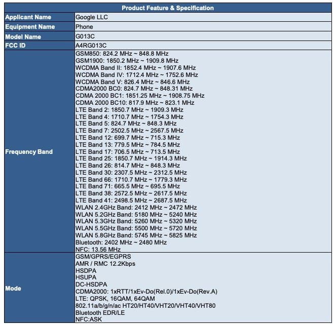 Смартфоны Google Pixel 3 и Google Pixel 3 XL получили модельные номера G103A и G103C. Они разработаны целиком самой Google и производятся тайваньским гигантом Foxconn. В документах отмечается поддержка четырёх основных операторов США, включая LTE Band 71, частот используемых T-Mobile. Также поддерживаются Bluetooth LE, NFC, Wi-Fi (802.11/ac) и беспроводная зарядка.