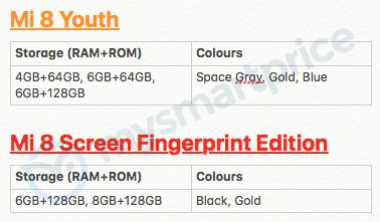 Xiaomi Mi 8 Youth выйдет в трёх вариантах — с 4 ГБ оперативной и 64 ГБ флэш-памяти, а также 6+64 ГБ и 6+128 ГБ. Он будет предлагаться в сером, золотистом и синем корпусах. Это слегка упрощённая модель по сравнению со стандартным смартфоном Xiaomi Mi 8. Основные характеристики включают однокристальную систему Snapdragon 710, как у Mi 8 SE, и камеры, как у Mi 8 и Mi 8 Explorer Edition.