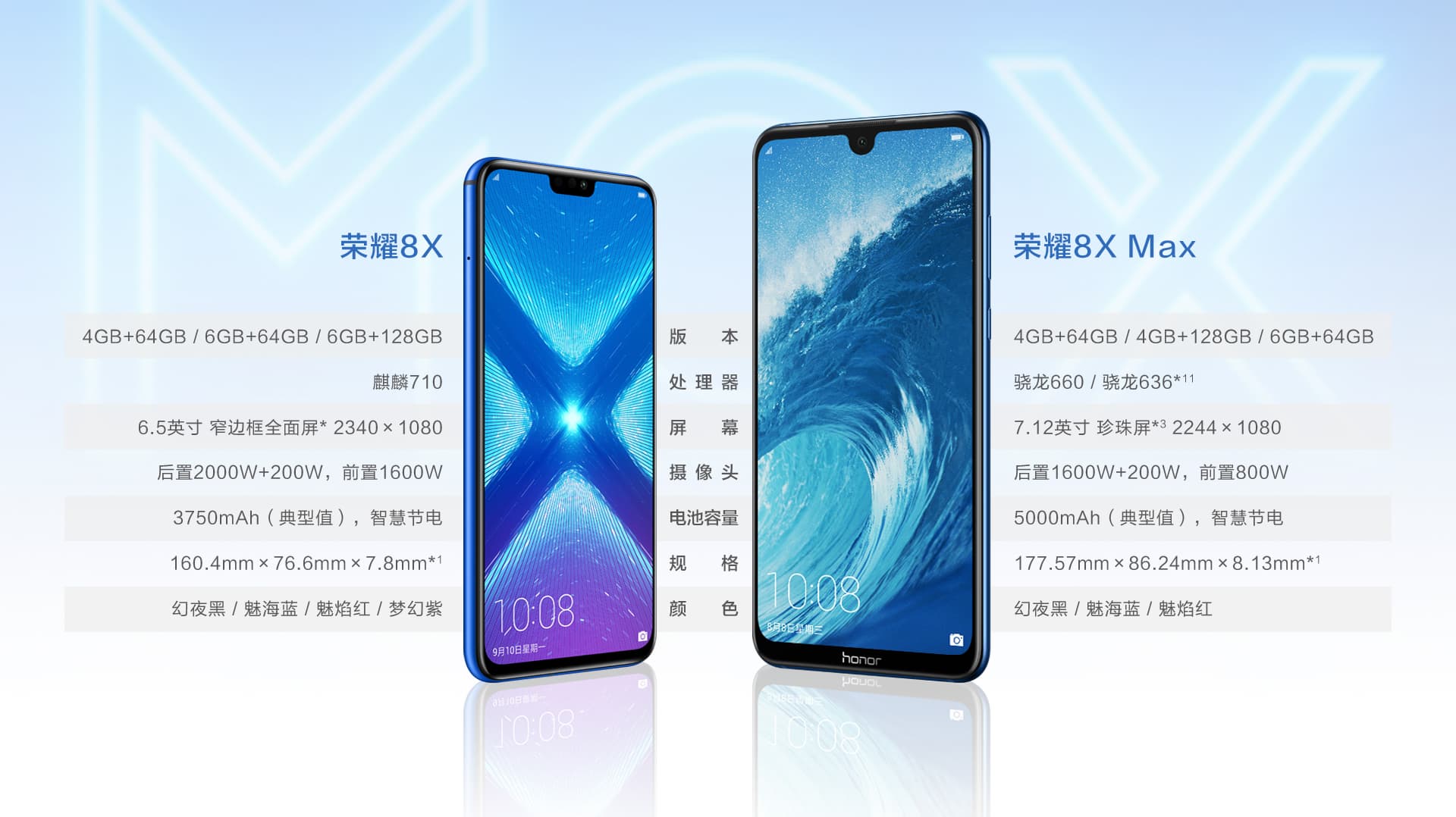 Honor 8X предлагается в таких вариантах: 4+64 ГБ за 204 доллара, 6+64 ГБ за 234 доллара и 6+128 ГБ за 278 долларов. Honor 8X Max с Snapdragon 636 оценен в 219 долларов за 4+64 ГБ и 263 доллара за 4+128 ГБ. Продажи начнутся 11 сентября в Китае. В октябре появится версия Honor 8X Max с Snapdragon 660, 6 ГБ ОЗУ и 64 ГБ флэш-памяти.