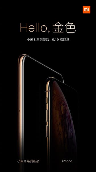 На подписи говорится, что 19 сентября мы увидим новые смартфоны серии Mi 8 и отмечается золотистый цвет. Смартфон показан рядом с новым iPhone в такой же цветовой гамме.
